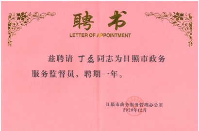 2020年12月3日,日照市政府服務(wù)管理辦公室、日照市行政審批服務(wù)局舉行日照市政務(wù)服務(wù)監(jiān)督員聘任儀式及政府開放日活動(dòng),公司董事、行政總監(jiān)丁磊被聘為日照市政務(wù)服務(wù)監(jiān)督員。